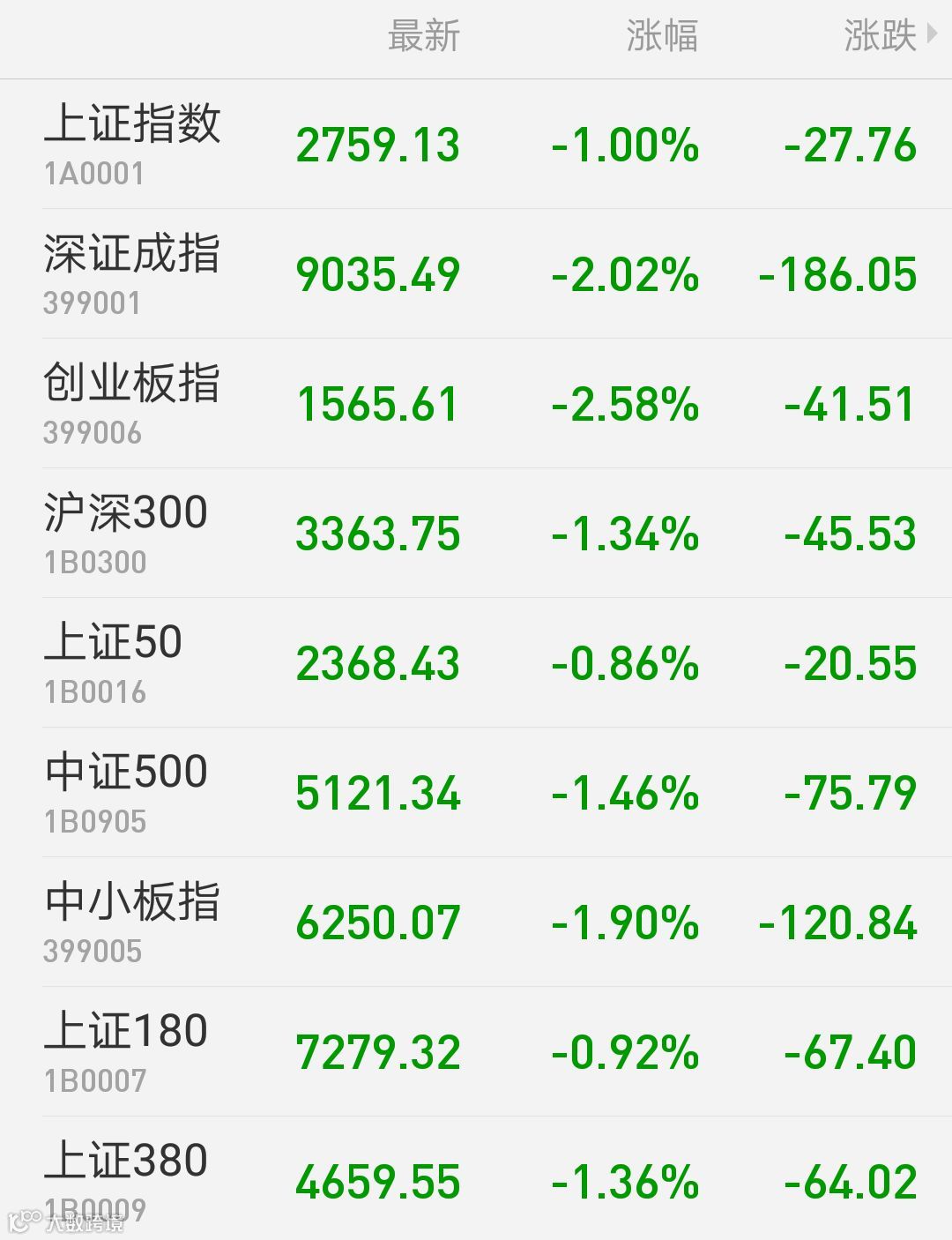 1、A股:上证指数报2759.13点,下跌1.00%,成交额1310.16亿。深证成指报9035.49点,下跌2.02%,成交额1986.62亿。创业板指报1565.61点,下跌2.58%,成交额732.33亿。两市合计成交3296.78亿。从盘面上看,仅有民航机场、钢铁、电力等板块上涨。