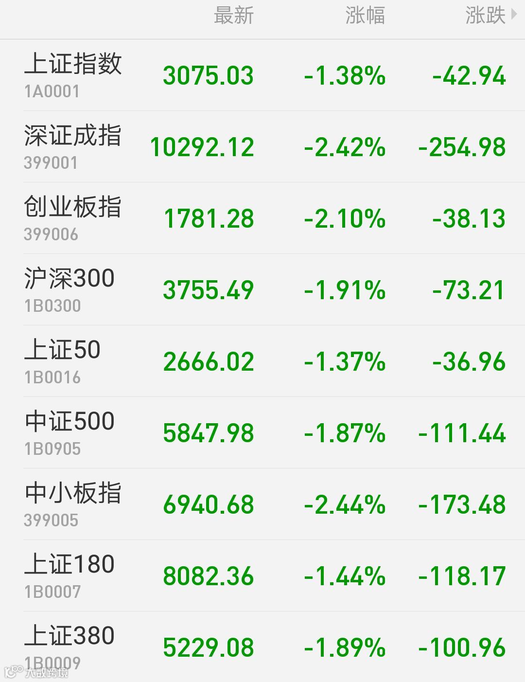 1、A股:上证指数报3075.03点,下跌1.38%,成交额1637.84亿。深证成指报10292.12点,下跌2.42%,成交额2611.66亿。创业板指报1781.28点,下跌2.10%,成交额900.91亿。两市合计成交4249.50亿。从盘面上看,受格力电器拒绝分红的影响,白马股遭到机构大面积砸盘,两市仅工艺商品板块上涨。