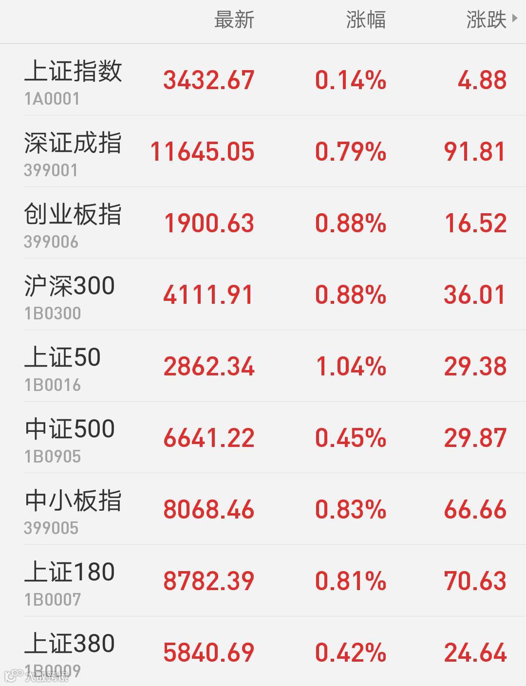 1、A股:上证指数报3432.67点,上涨0.14%,成交额2557.72亿。深证成指报11645.05点,上涨0.79%,成交额3121.55亿。创业板指报1900.63点,上涨0.88%,成交额861.21亿。两市合计成交5679.27亿。从盘面上看,券商、保险等板块涨幅居前。