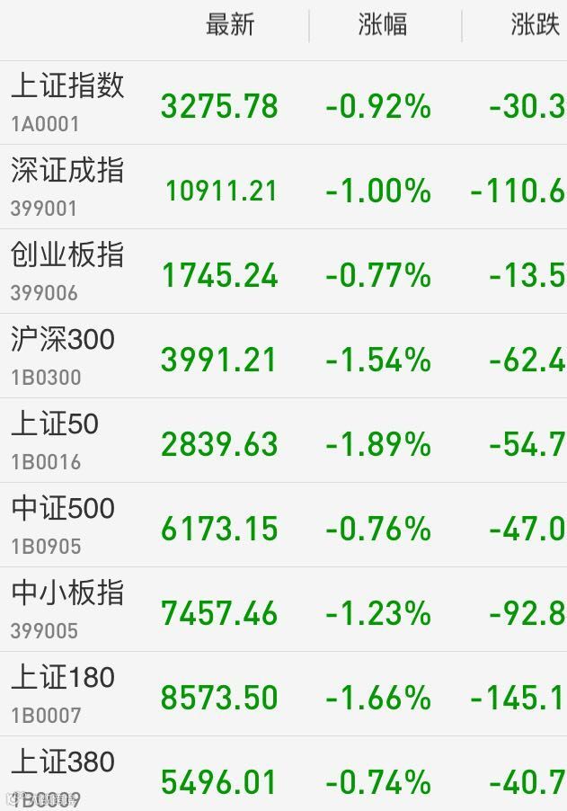 1、A股:上证综指早盘围绕3300点弱势整理,午后承压跳水,收跌0.92%报3275.78点;深成指跌1%失守11000点;创业板指数跌0.77%报1745.24点。两市成交4100亿元,较上日略有放大。新能源汽车板块多股拉升封板,次新股冲高回落,天然气概念股继续上涨,白马股深度回调。