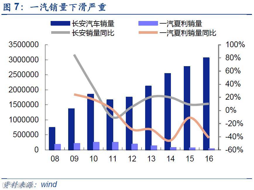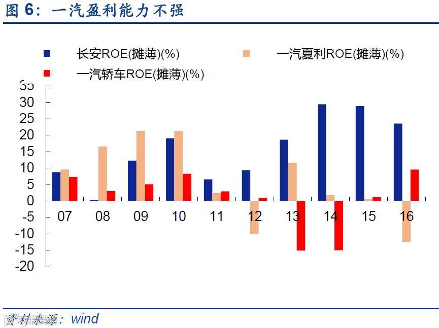 长安汽车盈利能力强,业绩优秀。根据长安汽车公布的产销数据,2017年1~6月,长安汽车累计产量为138万辆,而销量为143万辆,同比分别下滑5.3%和3.6%。然而2016年,长安汽车以102.85亿元净利润,成为重庆工业史上第一家净利润超过百亿元的内资企业,旗下自主品牌汽车销量达到128万辆,巩固了汽车自主品牌第一销量的地位。此外,长安汽车与百度合作开展了中国第一个无人驾驶试验并取得阶段性成果,2000km无人驾驶取得圆满成功。相比于一汽夏利和一汽汽车而言,长安盈利能力较强。