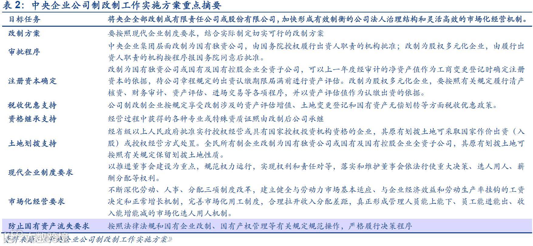 7月26日《中央企业公司制改制工作实施方案》出台。《实施方案》要求央企全部改制成有限责任公司或股份有限公司,加快形成有效制衡的公司法人治理结构和灵活高效的市场化经营机制。央企的公司制改制,是央企建立现代企业制度的关键一步,为将来混改、资产证券化的实施扫清了障碍,并有利于央企数量和管理层级的加速整合。