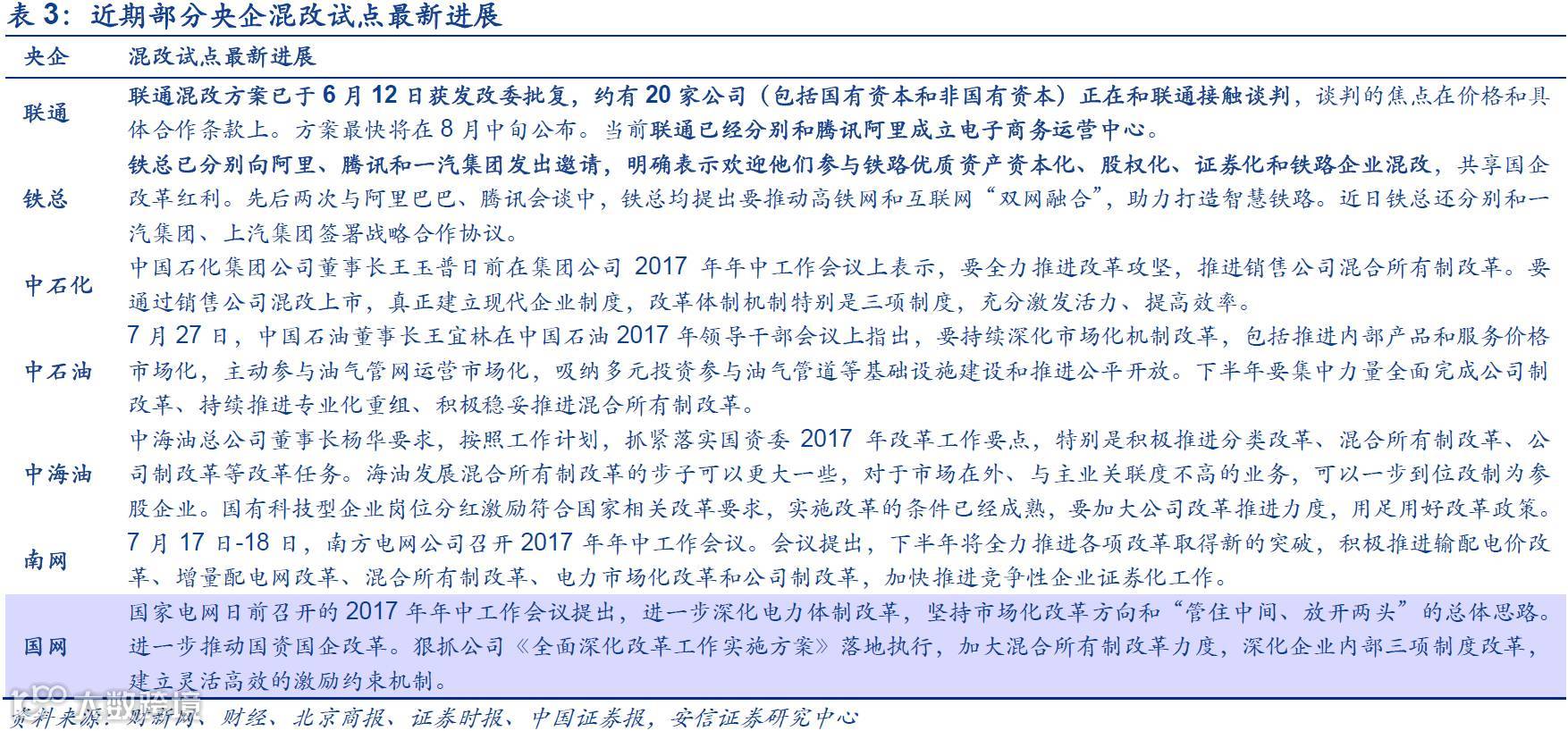 写在前面的话:在上个月的报告《国企改革:新标杆和新趋势》中,我们解析了国企改革的最新发展方向。正如我们此前一直强调的,进入第三季度,国企改革推进开始加速:央企方面,此前筹谋的央企重组如神华国电合并方案上报国务院;联通正与约20家公司进行混改最后阶段洽谈;铁总近期也动作频频,邀请阿里腾讯参与混改。地方国改方面,各地国改进展飞快,江苏召开国改推进会,天津、山西成立国资运营平台,上海成立国方母基金等。在十九大召开的前夕,中央和地方有争先展示国改成果的意愿强烈。当前国改进程如何?国改对资本市场有哪些影响?国改有哪些成果?这些成果将带来哪些投资机会?本篇报告为您解读。