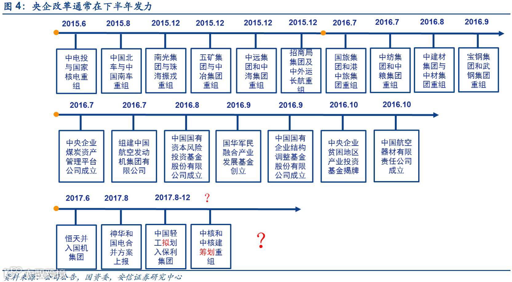 今年上半年自中国轻工和保利集团拟合并,中核和中核建筹划合并的消息以来,在2017年6月今年第一次央企合并才正式落地,随后在8月2日,神华和国电的合并方案正式上报。回顾2015年以来的各大央企合并重组情况,主要集中在下半年:上半年主要以规划为主,下半年是正式的操刀实施时间。我们认为,2017年下半年央企大概率会继续发生重组合并,重点关注业务趋同的企业。