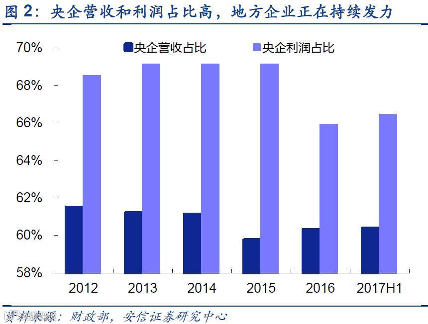 国企改革对于降低国有企业的杠杆率有显著成效,僵尸企业加速淘汰。自2015年年中以来,国有企业的资产负债率呈现持续下降趋势,截止2017年6月,国企微观杠杆率(负债/资产)已经从最高点的66.4%下降到65.6%。国有企业杠杆率的降低,加速淘汰落后高负债率僵尸企业。其中央企作为国企的主要利润贡献力量,在国改中业绩亮眼。央企营收占比在近几年均占60%,其中利润的贡献在最高时可达87.3%。截至2017年6月,央企利润累计达9352.1亿元,同比增长18.5%,地方国有企业利润则为4720.2亿元,同比增长达37.5%。值得一提的是,财政部数据显示2017年6月央企单月利润为2128.6亿元(详见文末注释1)。2017年上半年102家央企中游99家盈利,其中盈利超过10%的企业占48家。