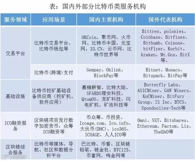 自比特币诞生以后,已经陆续出现了数百种的数字货币,围绕着数字货币生成、存储、交易形成了较为庞大的产业链生态。以比特币为例,参与机构主要可分为基础设施、交易平台、ICO融资服务、区块链综合服务等四类。