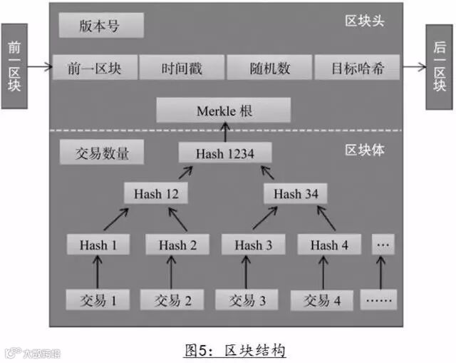 每个区块由区块头和区块体组成,区块体只负责记录前一段时间内的所有交易信息,主要包括交易数量和交易详情;区块头则封装了当前的版本号、前一区块地址、时间戳(记录该区块产生的时间,精确到秒)、随机数(记录解密该区块相关数学题的答案的值)、当前区块的目标哈希值、Merkle数的根值等信息。从结构来看,区块链的大部分功能都由区块头实现。