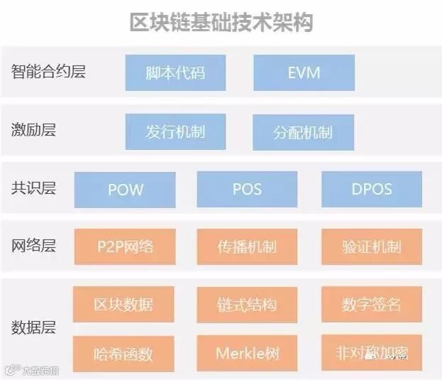 基础网络层由数据层、网络层组成,其中数据层包括了底层数据区块以及相关的数据加密和时间戳等技术;网络层则包括分布式组网机制、数据传播机制和数据验证机制等。