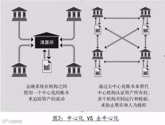 1)去中心化(Decentralization):区块链由众多节点组成一个端到端的网络,不存 在中心化的设备和管理机构,任一节点停止工作都会不影响系统整体的运作。图2的左侧描述了当今金融系统的中心化特征,右侧描述的是正在形成的去中心化金融系统;