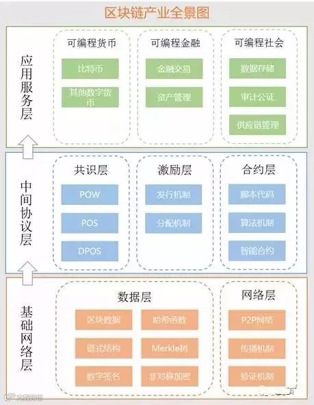 区块链产业链主要包括基础网络层、中间协议层及应用服务层。