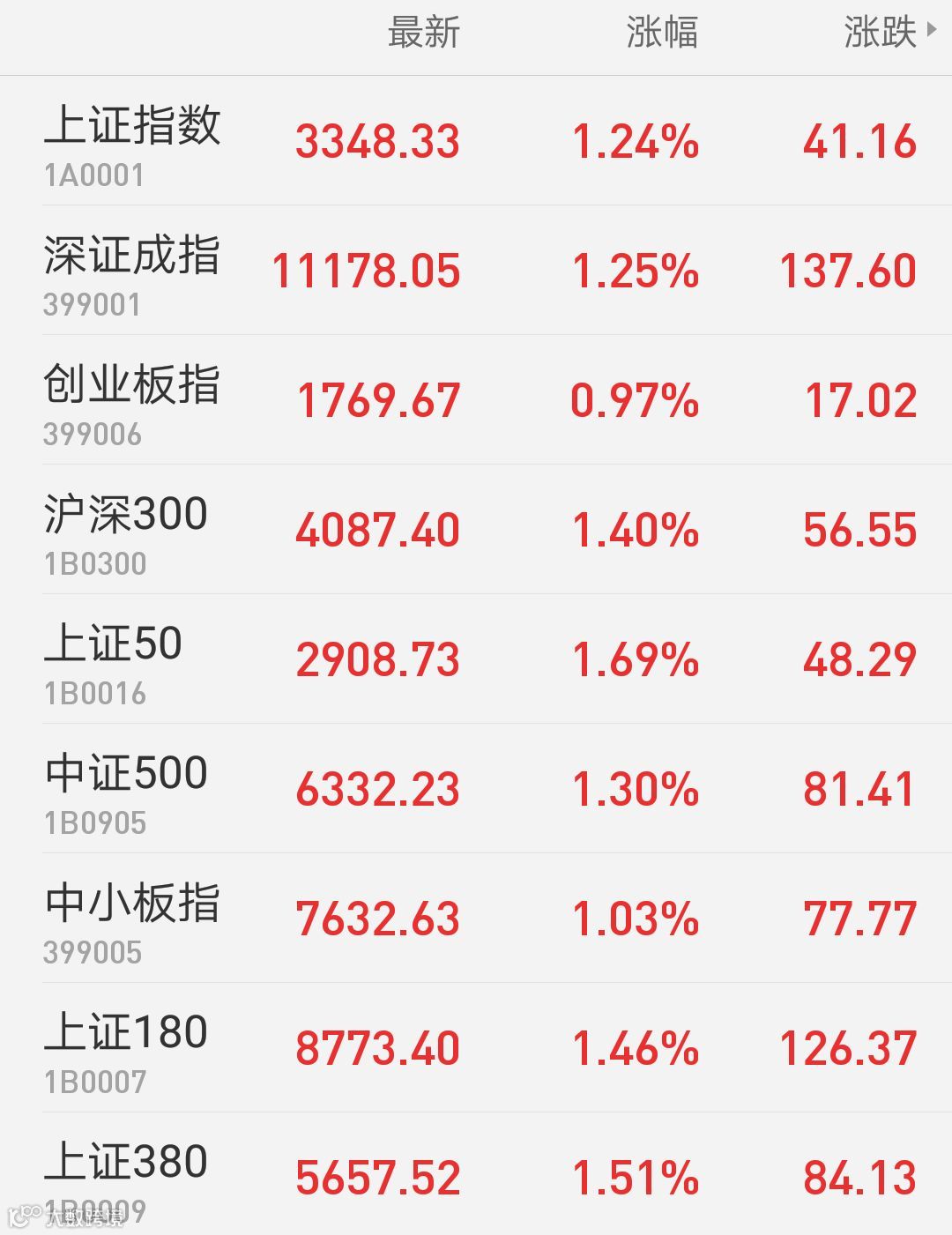 1、A股:上证指数报3348.33点,上涨1.24%,成交额2277.88亿。深证成指报11178.05点,上涨1.25%,成交额2177.36亿。创业板指报1769.67点,上涨0.97%,成交额469.24亿。两市合计成交4455.24亿。从盘面上看,水泥建材、煤炭采选等板块涨幅居前。