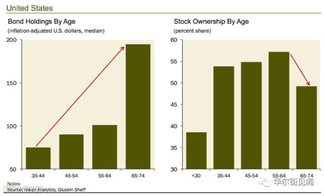 至于老龄人口对金融市场的影响,Haver Analytics经济学家Gluskin Sheff表示,年龄到65岁的人投资风格发生很大变化,他们开始削减股票资产,同时增持债券,这将带来债市繁荣。