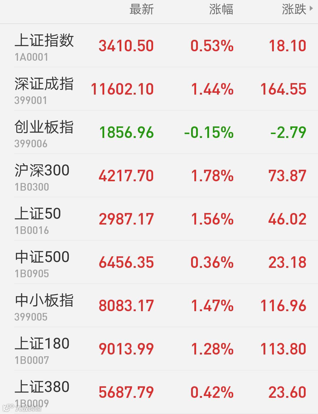 1、A股:上证指数报3410.5点,上涨0.53%,成交额2653.04亿。深证成指报11602.1点,上涨1.44%,成交额2972.28亿。创业板指报1856.96点,下跌0.15%,成交额708.35亿。两市合计成交5625.32亿。两市合计成交4894.09亿。从盘面上看,券商、保险等板块涨幅居前。