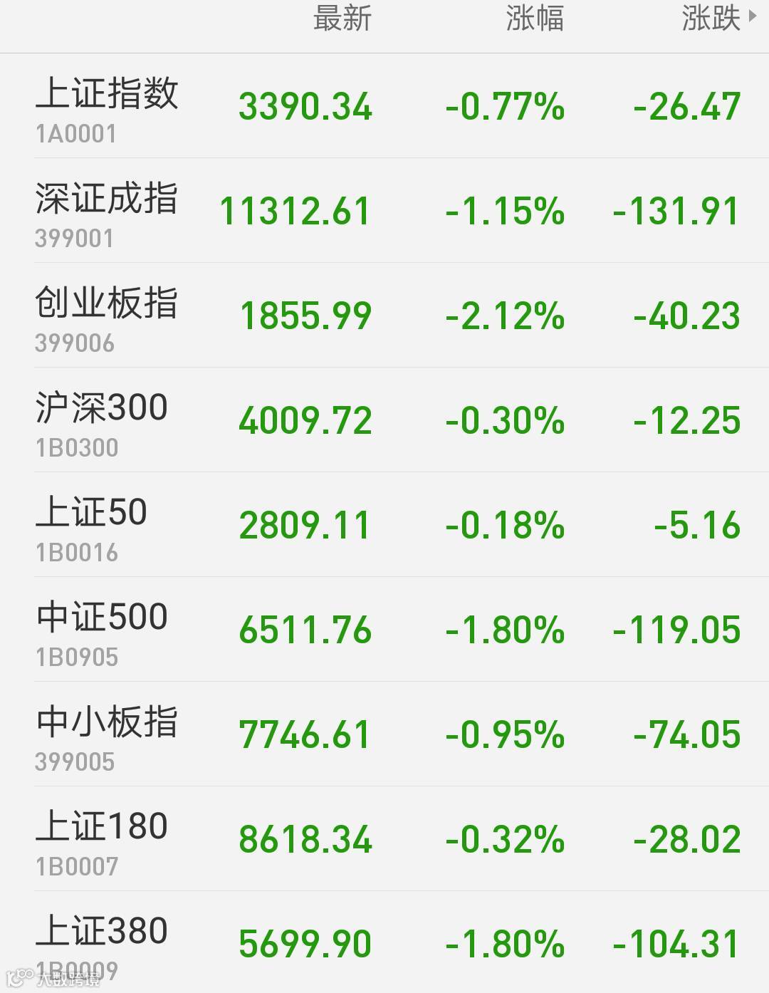 1、A股:上证指数报3390.34点,下跌0.77%,成交额2577.77亿。深证成指报11312.61点,下跌1.15%,成交额3047.01亿。创业板指报1855.99点,下跌2.12%,成交额832.08亿。两市合计成交5624.78亿。从盘面上看,保险、民航机场等板块涨幅居前。