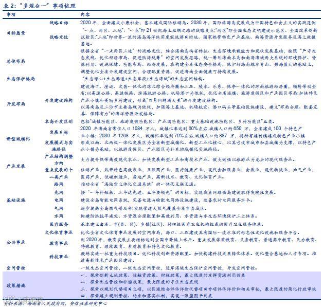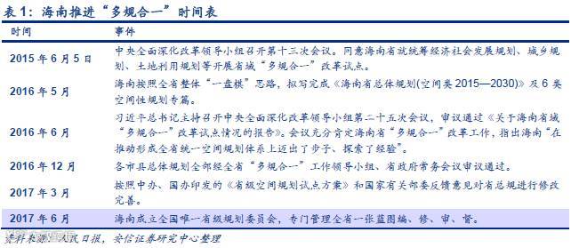 海南按照全省整体“一盘棋”思路,2016年5月拟写完成了《海南省总体规划(空间类2015—2030)》及6类空间性规划专篇。海南省“多规合一”改革随后获得了中央的充分肯定。