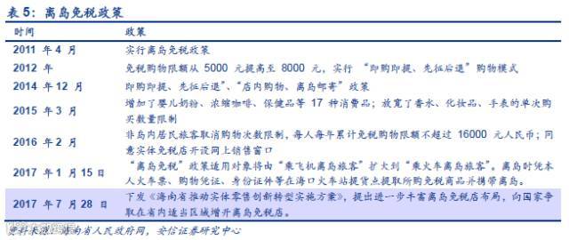 2011年4 月海南岛离岛免税政策正式落地实行,这是中央赋予海南国际旅游岛建设中含金量大、影响力最为广泛的重要政策之一,海南也是目前全国特殊的享有该项政策的省份。2017年7月28日海南省政府厅下发《海南省推动实体零售创新转型实施方案》,提出进一步丰富离岛免税店布局,向国家争取在省内适当区域增开离岛免税店。在过去的六年间,离岛免税业务不断调整,逐渐放宽了免税商品的购物限额和种类限制,不断创新购买、提货方式,大大升级了海南旅游的消费情况。