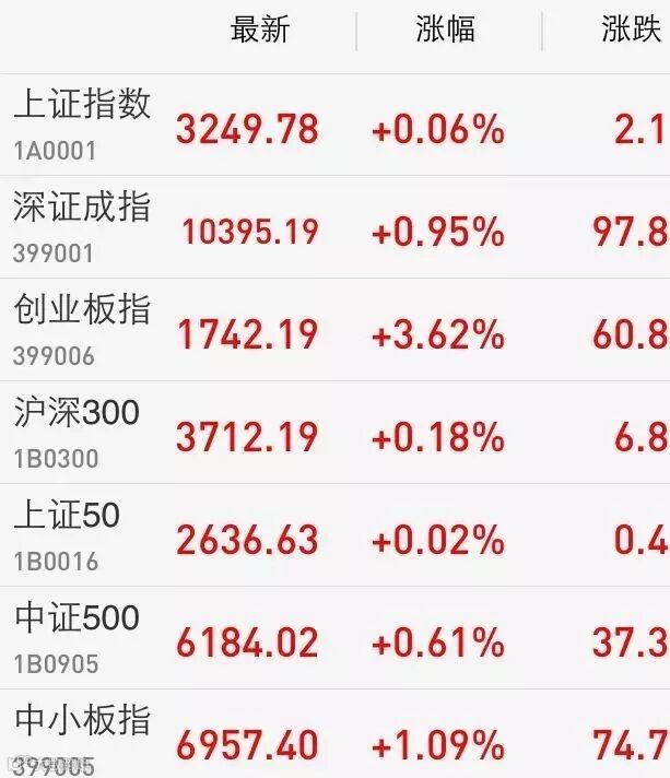 1、A股:A股迎来八二行情。上证综指收盘涨0.06%报3249.78点,深成指涨0.95%报10395.19点;创业板指涨3.62%报1742.19点,创去年5月3日以来最大单日涨幅。计算机、传媒等创业板代表性行业表现活跃。两市成交5525亿元,上日为4607亿元。