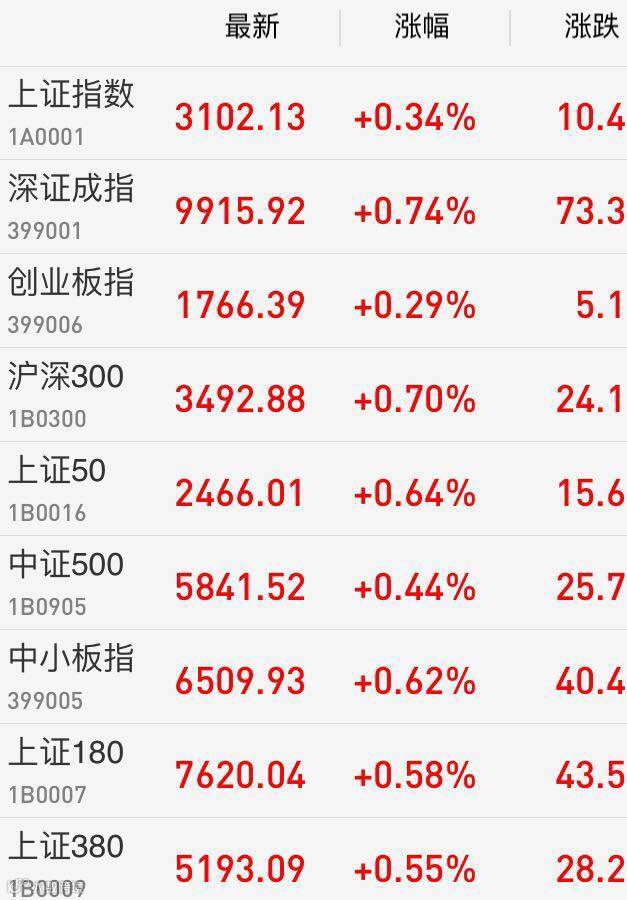 1、A股:上证指数报3102.13点,上涨0.34%,成交额1278.05亿。深证成指报9915.92点,上涨0.74%,成交额1700.17亿。创业板指报1766.39点,上涨0.29%,成交额469.88亿。两市合计成交2978.22亿。从盘面上看,白酒、国防军工等板块涨幅居前。