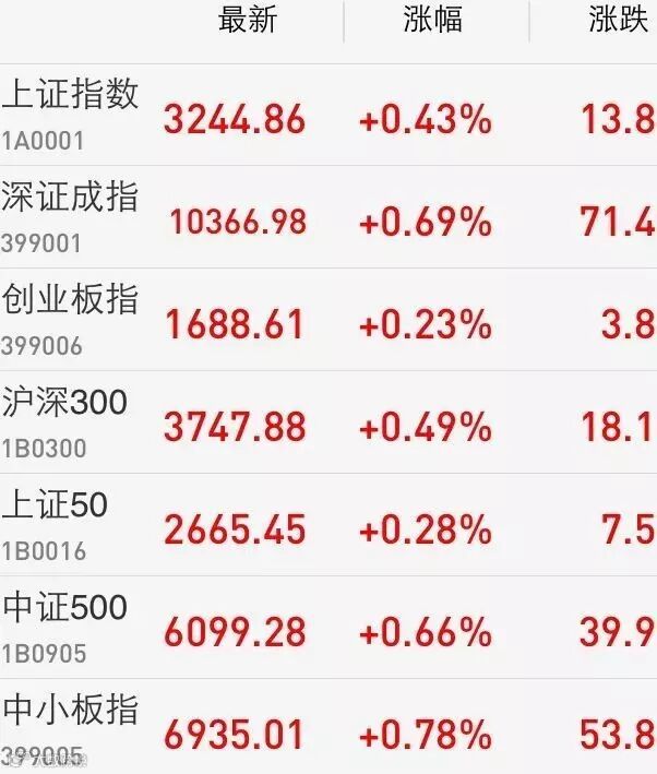 1、A股:沪指低开高走,连升三日续创本轮反弹以来新高。上证综指涨0.43%报3244.86点,深成指涨0.69%报10366.98点,创业板指涨0.23%报1688.61点。两市成交5032亿元,上日为5236亿元。石墨烯、锂电池概念股全天走势强劲。