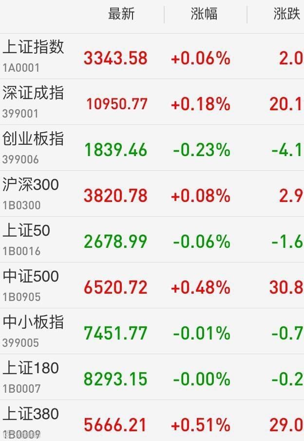 1、A股:上证综指缩量横盘,收盘微涨0.06%报3343.58点,结束此前三天连跌;深成指涨0.18%报10950.77点;创业板指跌0.23%报1839.46点。两市成交额仅4015亿元,创三个月新低,上个交易日成交4685亿元。
