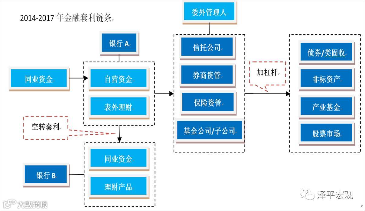 1、第一种观点认为,这次金融去杠杆是对过去6年金融自由化和加杠杆行为的总清算和全面整肃。2008年金融危机以来,货币刺激推升资产泡沫和金融杠杆。金融自由化导致影子银行崛起和监管套利,2011-2012年、2015-2016年商业银行负债增速远超M2增速,先后采用表外理财和同业存单进行主动负债,通过规避监管、放大杠杆进行套利。 因此,自2016年下半年以来启动的这次金融去杠杆是对过去6年金融自由化和加杠杆行为的总清算,以及对金融秩序的全面整肃。如果是总清算的话,那么未来一定要看到“三三四”整治达到效果,即使由于界定宽泛误伤实体经济也只会微调而不会收手,这意味着这次金融去杠杆持续的时间和力度将远超市场想象,经济二次探底的幅度和股债市场调整的幅度也将远超市场想象。