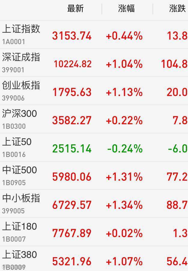 1、A股:上证指数报3153.74点,上涨0.44%,成交额1484.58亿。深证成指报10224.82点,上涨1.04%,成交额2086.14亿。创业板指报1795.63点,上涨1.13%,成交额536.25亿。两市合计成交3570.71亿。从盘面上看,有色金属、汽车制造等板块上涨。