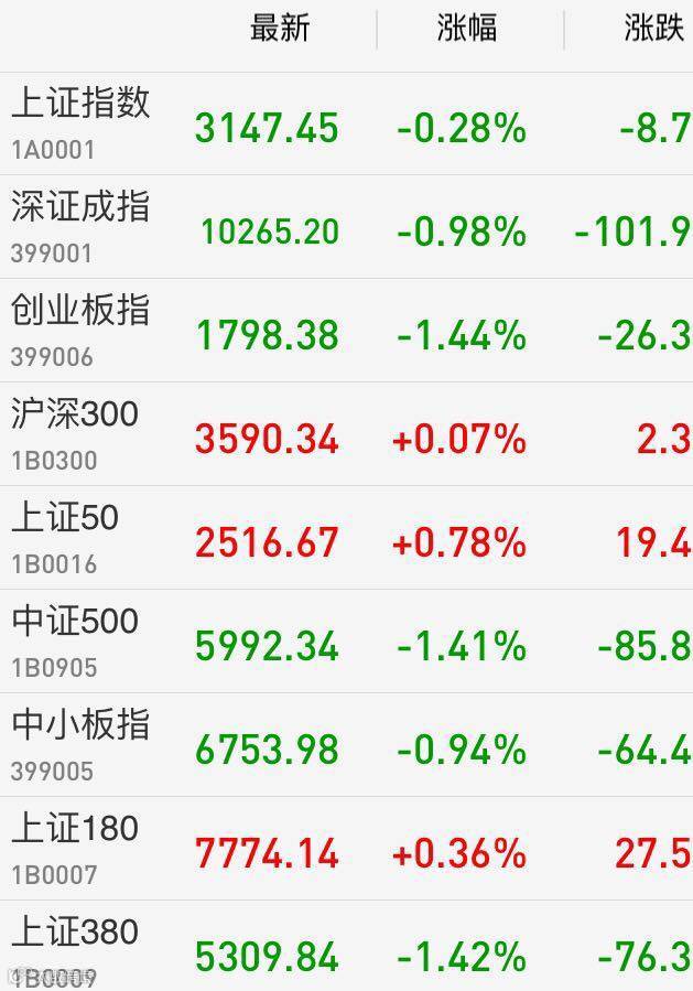1、A股:上证指数报3147.45点,下跌0.28%,成交额2204.38亿。深证成指报10265.2点,下跌0.98%,成交额2576.81亿。创业板指报1798.38点,下跌1.44%,成交额629.66亿。两市合计成交4781.19亿。从盘面上看,两市银行、保险板块上涨。