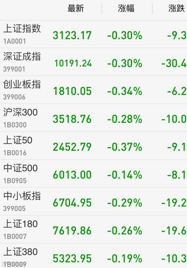 1、A股:上证指数报3123.17点,下跌0.3%,成交额1492.15亿。深证成指报10191.24点,下跌0.3%,成交额2140.26亿。创业板指报1810.05点,下跌0.34%,成交额623.71亿。两市合计成交3632.41亿。从盘面上看,自贸区、军工等板块涨幅居前。