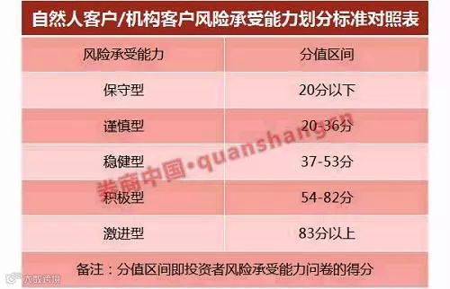 1、得分20分以下,为保守型投资者,只能购买或接受“包括但不限于国债、债券质押式逆回购业务、债券质押式报价回购业务、货币型产品、银行保本型理财产品及相关服务”(低风险)