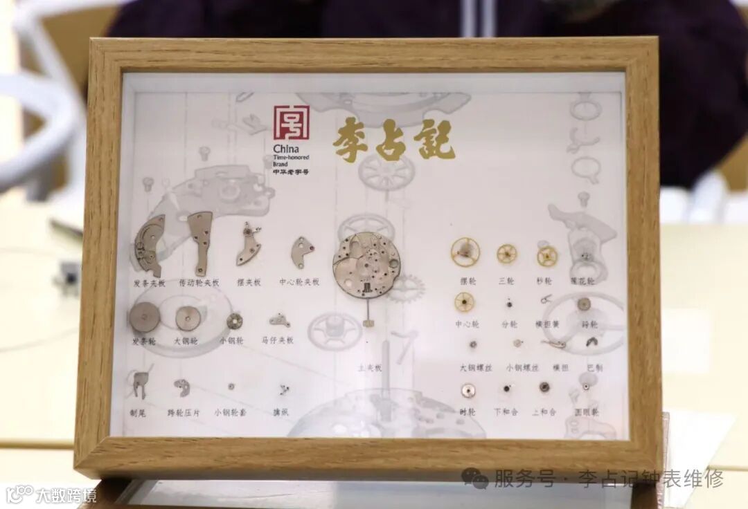 活动现场,李占记非遗传承人团队带领参与者开启精密机械体验。通过“沉浸式体验”突破代际壁垒,从青年到中年的参与者亲手操作修表工具,在传承人指导下将机芯分解为齿轮、夹板、擒纵部分等零件,最终装裱于定制亚克力相框,形成独一无二的“机芯艺术标本”。李占记以机芯艺术标本为媒介,成功解锁非遗技艺的“生活化密码”,让深藏于维修台后的钟表维修技艺走进烟火日常。参与者获得的机芯艺术标本不仅是一件艺术品,更是一张可以带回家的“非遗体验卡”。