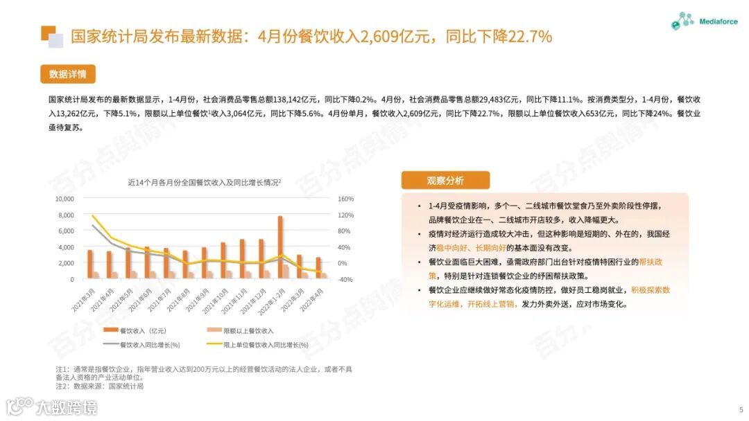 根据国家统计局发布的最新统计数据,1-4月餐饮收入13262亿元,下降5.1%;4月餐饮收入2609亿元,同比下降22.7%。受疫情影响,从1月到4月,许多一线和二线城市的进餐甚至外卖都被暂停。品牌餐饮公司在一线和二线城市开设了更多门店,收入下降幅度更大。