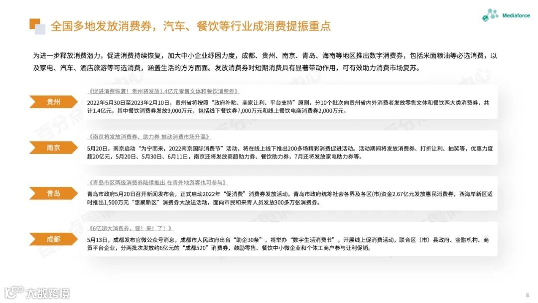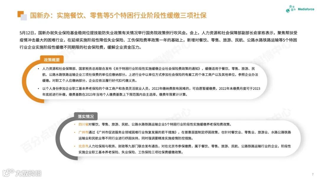 为了帮助受疫情影响最严重的困难行业,国家新对餐饮、零售等五个极端困难行业的企业分阶段推迟不同时期的社会保险费,以缓解企业的财务压力。四川、广州、北京等地已经开始。着陆。此外,全国许多地方都发放了消费券,以进一步释放消费潜力,帮助消费市场复苏。