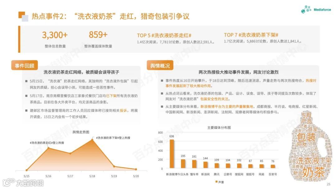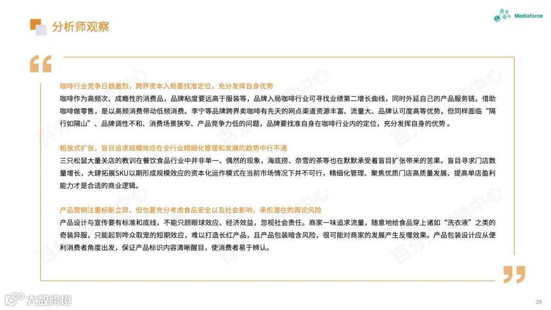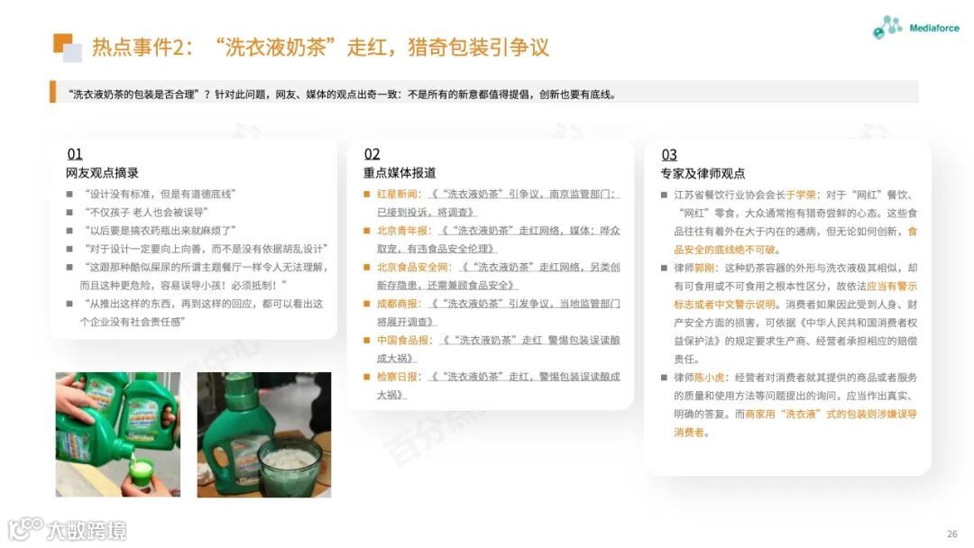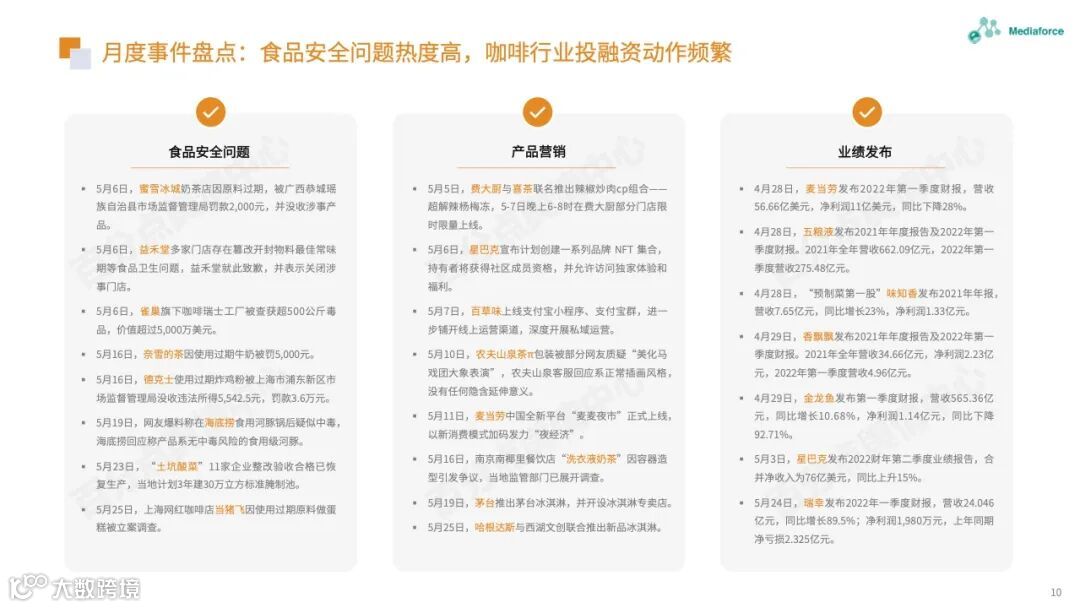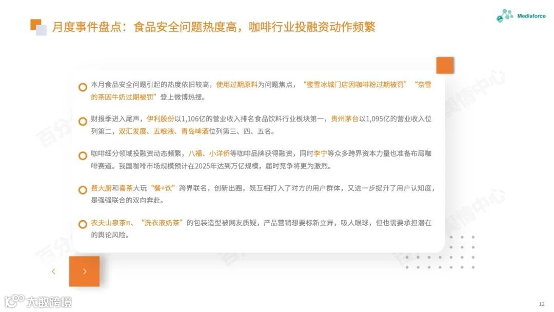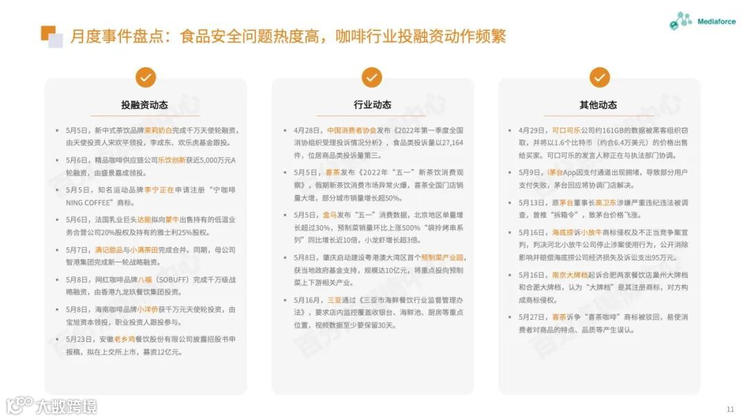 本月由食品安全问题引起的高温仍然很高,过期原料的使用已成为问题的焦点。咖啡行业有着频繁的投资和融资趋势。巴福、晓阳桥等咖啡品牌已获得融资,李宁等跨境资本也在准备部署咖啡轨道。农夫春茶π和“洗衣液奶茶”的包装受到网民质疑。产品营销想要与众不同,但也需要承担潜在的舆论风险。
