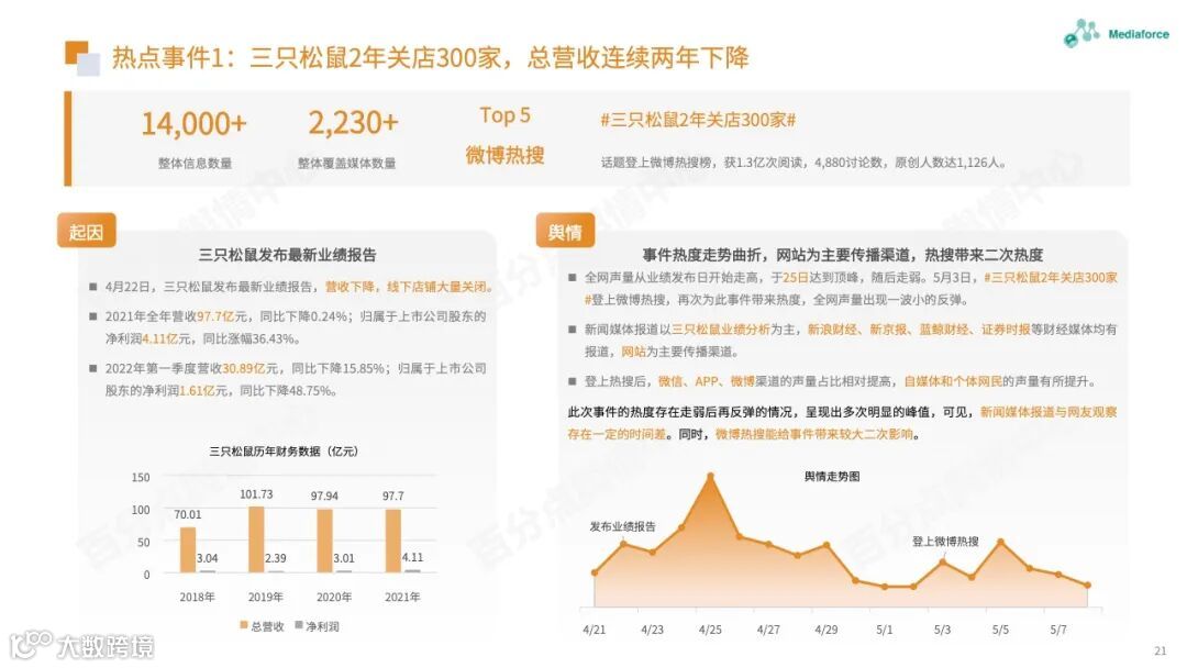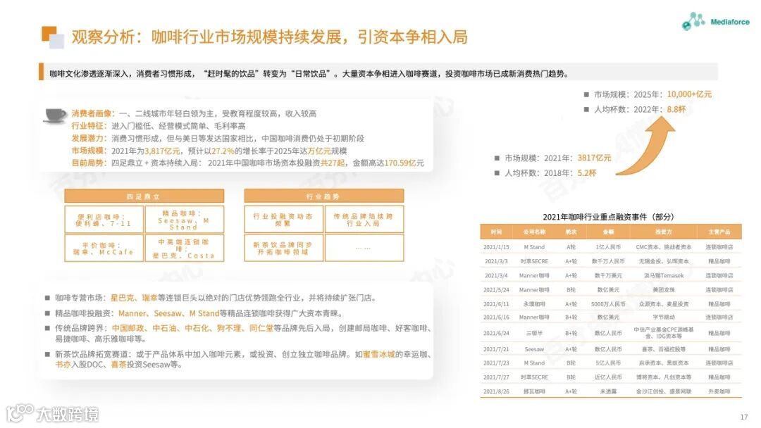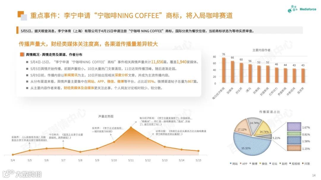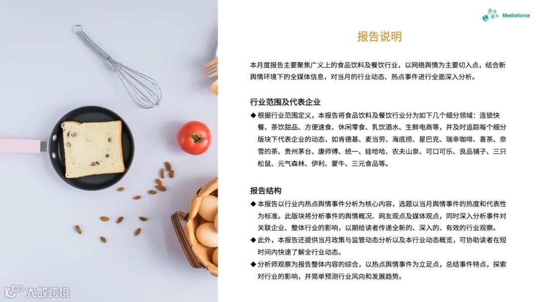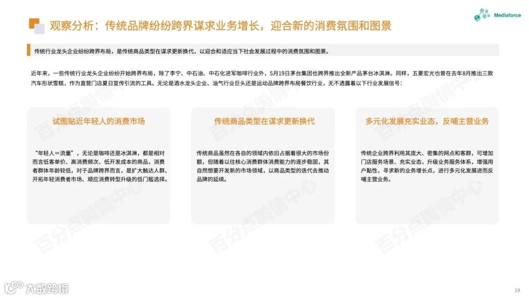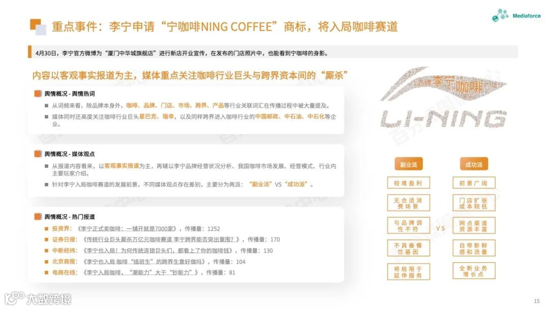 本月由食品安全问题引起的高温仍然很高,过期原料的使用已成为问题的焦点。咖啡行业有着频繁的投资和融资趋势。巴福、晓阳桥等咖啡品牌已获得融资,李宁等跨境资本也在准备部署咖啡轨道。农夫春茶π和“洗衣液奶茶”的包装受到网民质疑。产品营销想要与众不同,但也需要承担潜在的舆论风险。