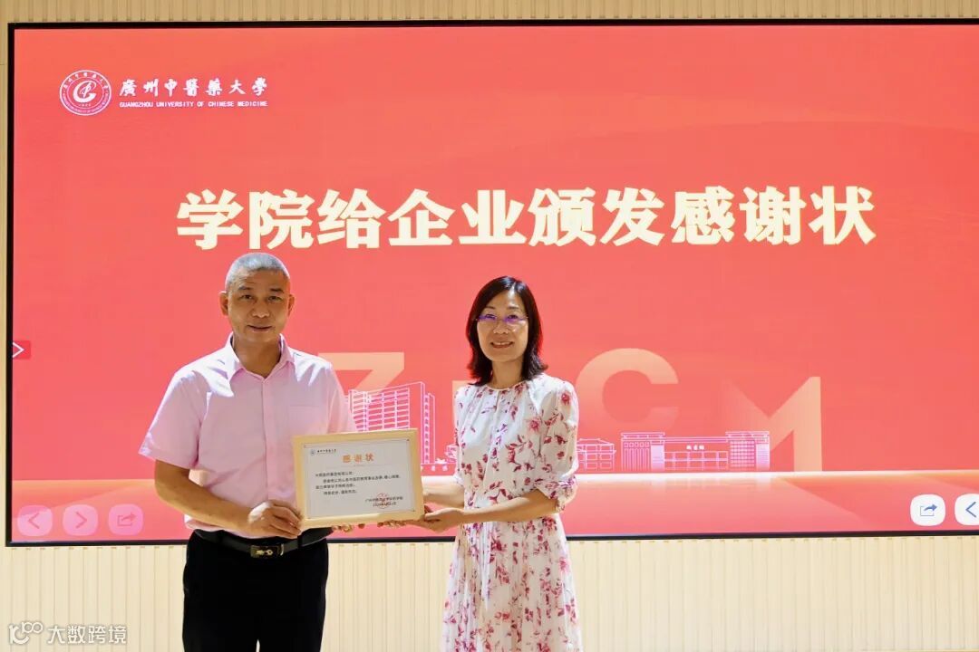 张娟书记为大翔医药集团有限公司陈东平董事长颁发感谢状,在陈东平董事长的带领下,大翔集团一直积极关注中医药教育事业的发展,暖心捐赠,帮助了众多学生渡过难关。