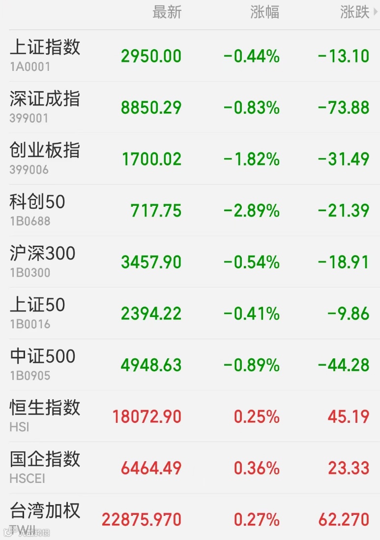 1、A股:A股继续下探,创业板指盘中跌逾2%,半导体、存储芯片、CPO等概念股下挫明显,工业母机、维生素、教育、房地产等板块走强。截至收盘,上证指数跌0.44%报2950点,深证成指跌0.83%,创业板指跌1.82%,科创50跌2.89%,北证50涨0.3%,万得全A跌0.57%,万得双创跌1.61%。市场成交额6511.9亿元,北向资金净卖出33.67亿元,比亚迪遭净卖出5.23亿最多,立讯精密获净买入2.25亿元居首。