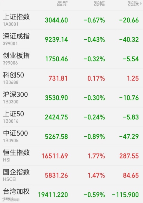 1、A股:A股震荡走弱,周期股表现低迷,军工股逆市走强,6连板春光科技上演“天地板”。截至收盘,上证指数跌0.67%报3044.60点,深证成指跌0.43%,创业板指跌0.32%,北证50涨0.01%,科创50涨0.17%,上证50跌0.24%,深证50涨0.09%,万得全A跌0.49%,万得微盘股指数跌1.64%,万得双创跌0.09%。A股成交额为8258.7亿元,北向资金净买入13.89亿元,贵州茅台获净买入8.91亿元居首,中际旭创遭净卖出3.79亿元最多。