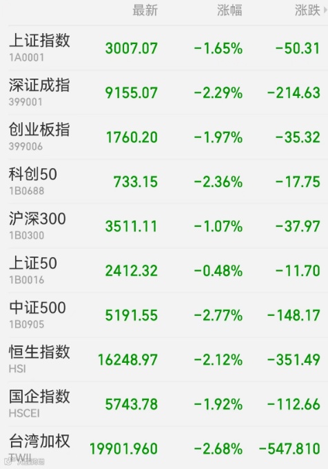 1、A股:A股大幅调整,上证指数退守3000点,小微盘股持续大跌,“中字头”逆势飘红。截至收盘,上证指数下跌1.65%报3007.07点,深证成指跌2.29%,创业板指跌1.97%,北证50跌3.87%,科创50跌2.36%,上证50跌0.48%,深证50跌0.97%,万得全A跌2.96%,万得微盘股指数跌10.55%,万得双创跌4.49%。A股成交额降至9520.9亿元,北向资金净卖出27.93亿元,迈瑞医疗遭净卖出4.16亿元最多,贵州茅台获净买入2.48亿元居首。