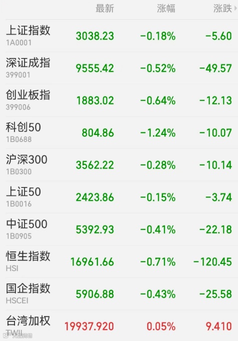 2、港股:港股冲高回落,恒生指数跌0.71%报16961.66点,恒生科技指数跌1.44%,恒生国企指数跌0.43%,医疗股领跌,科技股下挫,“蔚小理”齐跌,金融股走低。大市成交1131.3亿港元,南向资金净买入额为26.02亿港元,中国石油化工股份获净买入3.78亿港元最多,盈富基金遭净卖出7.74亿港元居首。中国台湾加权指数收盘涨0.05%,报19337.92点。