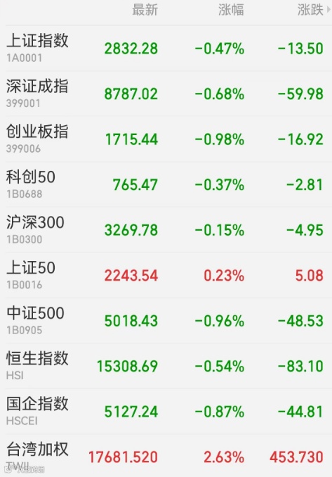 1、A股:A股缩量回调,新能源赛道走弱,旅游、传媒及游戏板块活跃。截至收盘,上证指数下跌0.47%报2832.28点,周跌1.72%;深证成指跌0.68%,周跌2.33%;创业板指跌0.98%,周跌2.60%;北证50涨2.53%,周涨3.96%;科创50跌0.37%,周跌1.66%;上证50涨0.23%,周涨0.28%;深证50跌0.28%,周跌0.81%;万得全A跌0.71%,周跌2.65%;万得双创跌1.35%,周跌4.25%;万得微盘股指数跌1.58%,周跌6.37%。A股成交额萎缩至6805.4亿元,北向资金净卖出52.09亿元,隆基绿能遭净卖出3.75亿元最多,贵州茅台获净买入7.76亿元居首。