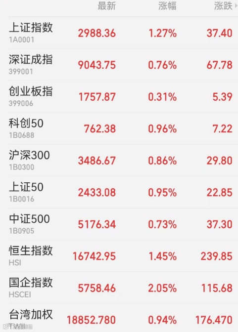 1、A股:A股延续反弹,上证指数豪取7连阳,创三年半以来最长连涨纪录。市场量能出现萎缩,逾4500股上涨,煤炭、石油领涨。上证指数收涨1.27%报2988.36点,深证成指涨0.76%,创业板指涨0.31%,科创50指数涨0.96%,北证50指数涨1.04%,万得全A涨1.24%,万得双创涨1.55%。市场成交额8309.3亿元,北向资金实际净买入36.9亿元,贵州茅台、宁德时代均连续4日获加仓。
