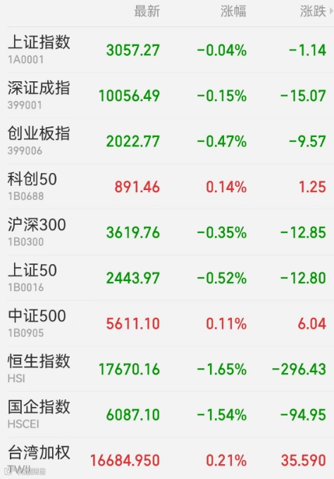 1、A股:A股探底回升,中小票再度出现普涨,CPO、算力概念涨势强劲,新能源、大消费依旧疲软。全天超2800家公司上涨,赚钱效应继续保持。上证指数收盘微跌0.04%报3057.27点,深证成指跌0.15%,创业板指跌0.47%,北证50涨1.37%,万得全A、万得双创双双收涨;A股全天成交9950.1亿元;北向资金净卖出近46亿元,宁德时代遭净卖出11.17亿元。
