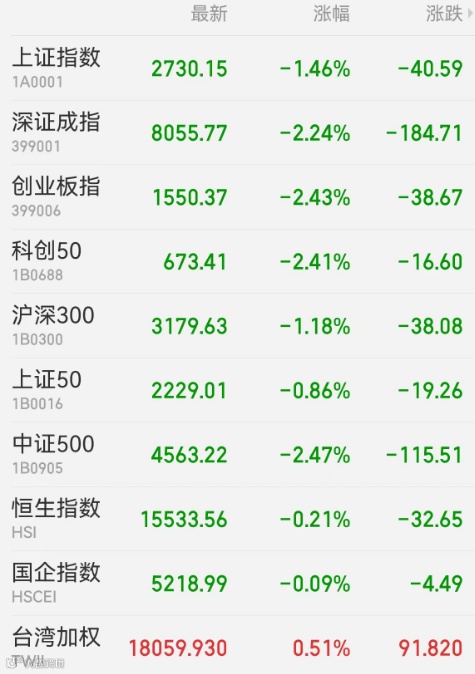 1、A股:上周五A股延续调整态势,尾盘市场上演一波“深V”反弹,上证指数一度跌近4%失守2700点,市场超5000股下跌,药明康德闪崩跌停,遭北向资金净卖出近6亿元。上证指数收跌1.46%报2730.15点,深证成指跌2.24%,创业板指跌2.43%,科创50指数跌2.41%,北证50跌4.8%,万得全A跌2.43%,万得双创跌3.72%,万得微盘股指数跌6.14%。市场合计成交额8142.4亿元;北向资金实际净买入23.6亿元,上周累计“加仓”近100亿元。上周,上证指数累计下跌6.19%,创业板指跌7.85%。