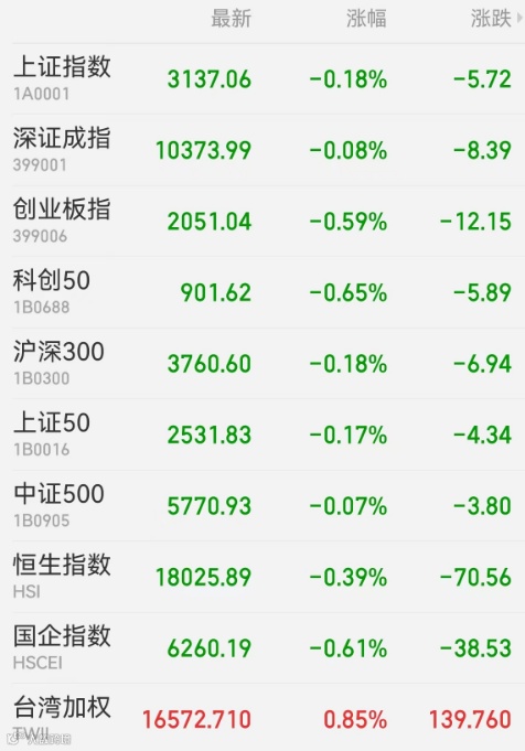 2、港股:香港恒生指数收跌0.39%,报18025.89点,恒生科技指数跌0.47%,恒生国企指数跌0.61%。油气、有色板块跌幅居前,中国石油跌近5%,中国石化跌近3%,五矿资源跌超7%;内房股走势分化,远洋集团暴涨82.42%,融创中国跌7.49%。大市成交841.11亿港元,南向资金净买入67.29亿港元,盈富基金获净买入22.56亿港元居首,中国海洋石油遭净卖出2.47亿港元最多。中国台湾加权指数收涨0.85%,报16572.71点。