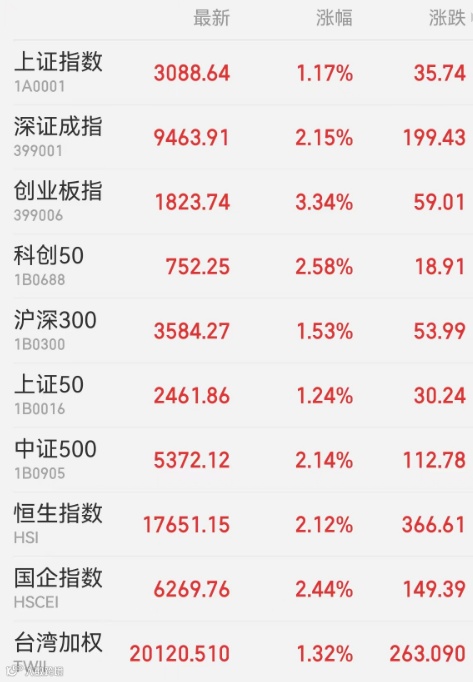 1、A股:A股放量大涨,成交额时隔8日重回万亿上方,北向资金爆买逾200亿元。市场超3900股飘红,素有“牛市旗手”之称的券商板块扛起领涨大旗,个股批量涨停;地产板块拉升,量子科技概念崛起,算力、CPO等AI产业链股再度活跃,中际旭创涨超12%再创历史新高,市值近5000亿的工业富联涨停。截至收盘,上证指数涨1.17%报3088.64点,深证成指涨2.15%,创业板指涨3.34%,北证50涨0.94%,科创50涨2.58%,万得微盘股指数涨0.58%,万得全A涨1.70%,万得双创涨2.62%。市场全天成交1.09万亿元,北向资金大幅净买入224.49亿元,创陆股通开通以来新高,招商银行获净买入9.73亿元最多,江苏银行遭净卖出9.99亿元居首。上周上证指数涨0.76%,深证成指涨1.99%,创业板指涨3.86%。