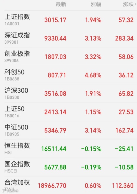 2、港股:港股三大指数冲高回落,恒生指数收盘跌0.15%报16511.44点,恒生科技指数涨0.14%报3431.3点,恒生国企指数跌0.19%报5677.88点。能源、电讯板块领跌,光伏、半导体、医药股走强,科技股涨跌参半。大市成交1303.51亿港元,南向资金净买入13.68亿港元。中国台湾加权指数收涨0.6%。