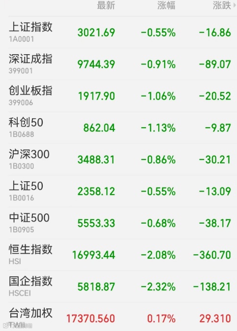 2、港股:恒生指数跌2.08%,报16993.44点。恒生科技指数跌2.25%,报3910.24点。国企指数跌2.32%,报5818.87点。黄金、教育、稀土等概念涨幅居前,黄金股逆势走强,招金矿业涨超5%,灵宝黄金涨近5%;汽车、内房、中资券商、生物医药等行业跌幅居前。