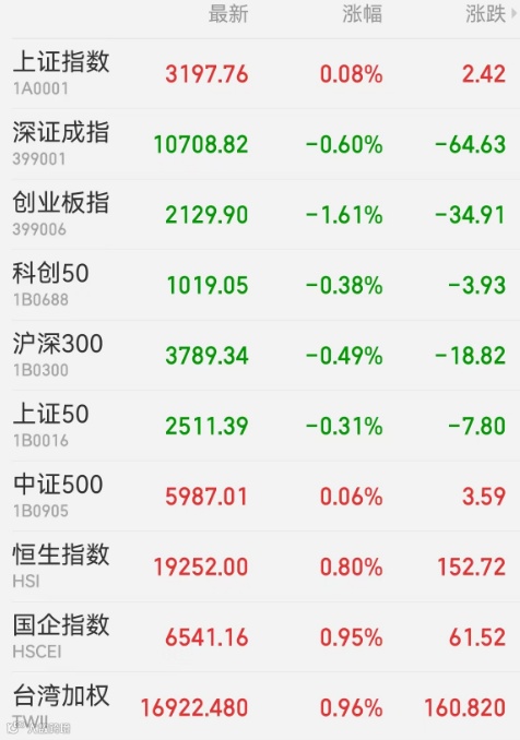 2、港股:香港恒生指数收涨0.80%报19252点,恒生科技指数涨2.26%,恒生国企指数涨0.95%。科技、博彩、文旅、医药股涨幅居前,创科实业涨近6%领涨蓝筹。市场再现闪崩股,中天湖南集团暴跌76%,海昌海洋公园跌超27%。大市成交867.24亿港元,南向资金净买入2.41亿港元,中国石油化工股份获净买入1.93亿港元居首,美团遭净卖出3.09亿港元最多。中国台湾加权指数收涨0.96%报16922.48点。