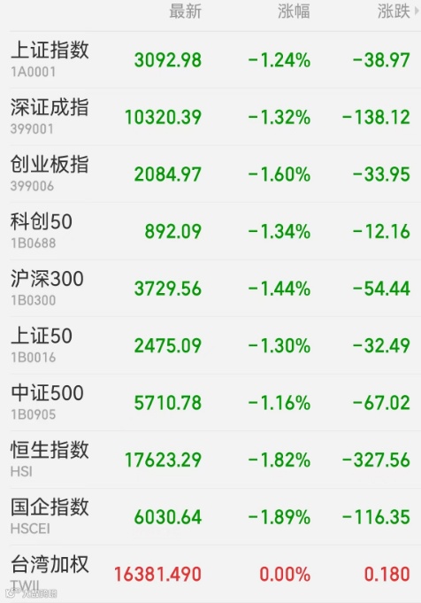 1、A股:A股持续调整,上证指数失守3100点,券商、机场板块大跌,环保股逆势走强,国泰环保连续两日“20cm涨停”。上证指数收跌1.24%,报3092.98点,深证成指跌1.32%,创业板指跌1.60%,科创50指数跌1.34%,北证50跌1.27%,万得全A跌1.15%,万得双创跌1.08%。A股成交额为6791亿元,北向资金净卖出64.12亿元,连续11日减仓,贵州茅台遭净卖出9.94亿元居首,华泰证券获净买入5.34亿元最多。