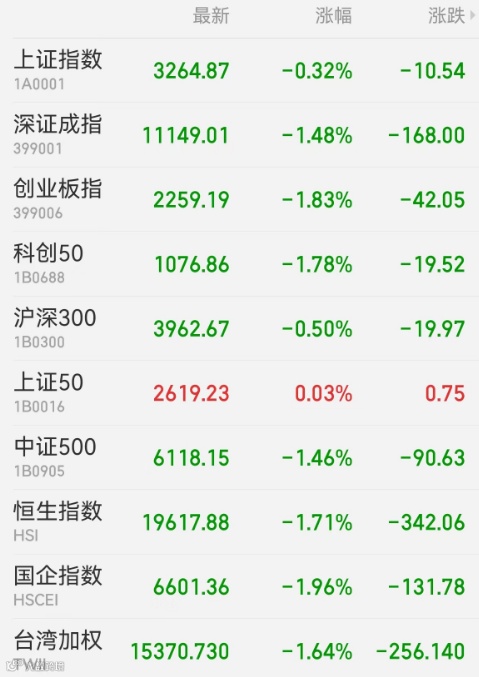 1、A股:A股开盘后震荡下探,三大股指一度跌逾1%,沪指跌破3230点后获得支撑,尾盘股指跌幅收窄。锂电池、6G、CRO、工业母机、光伏题材跌幅靠前;石油、银行、游戏、传媒逆势走强。市场超4000只个股下跌,百余股跌超9%。截至收盘,上证指数跌0.32%报3264.87点,录得五连阴;深证成指跌1.48%,创业板指跌1.83%,科创50指数跌1.78%,北证50跌2.38%,万得全A跌1.16%,万得双创跌2.16%;市场成交额11354亿元,连续16个交易日突破万亿元。北向资金净卖出49.17亿元,宁德时代、比亚迪、中国平安分别遭净卖出8.83亿元、7.03亿元、6.69亿元。